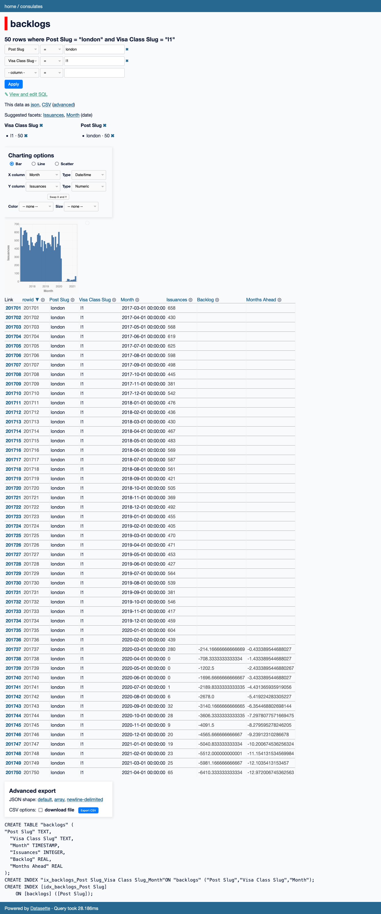 Shows an interesting graph where the number of L1 visa issuances in London drops from around 500 a month to 0 around March/April 2020, eventually climbing to between 19 and 65 per month in the past few months up to today.